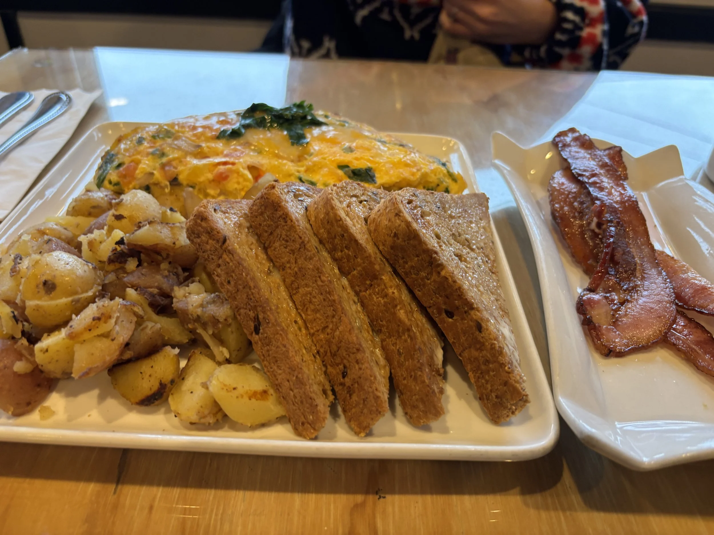 After an hour wait we understood why people come — simple brunch done properly: omelette and hash browns, exactly what we needed after travel.
